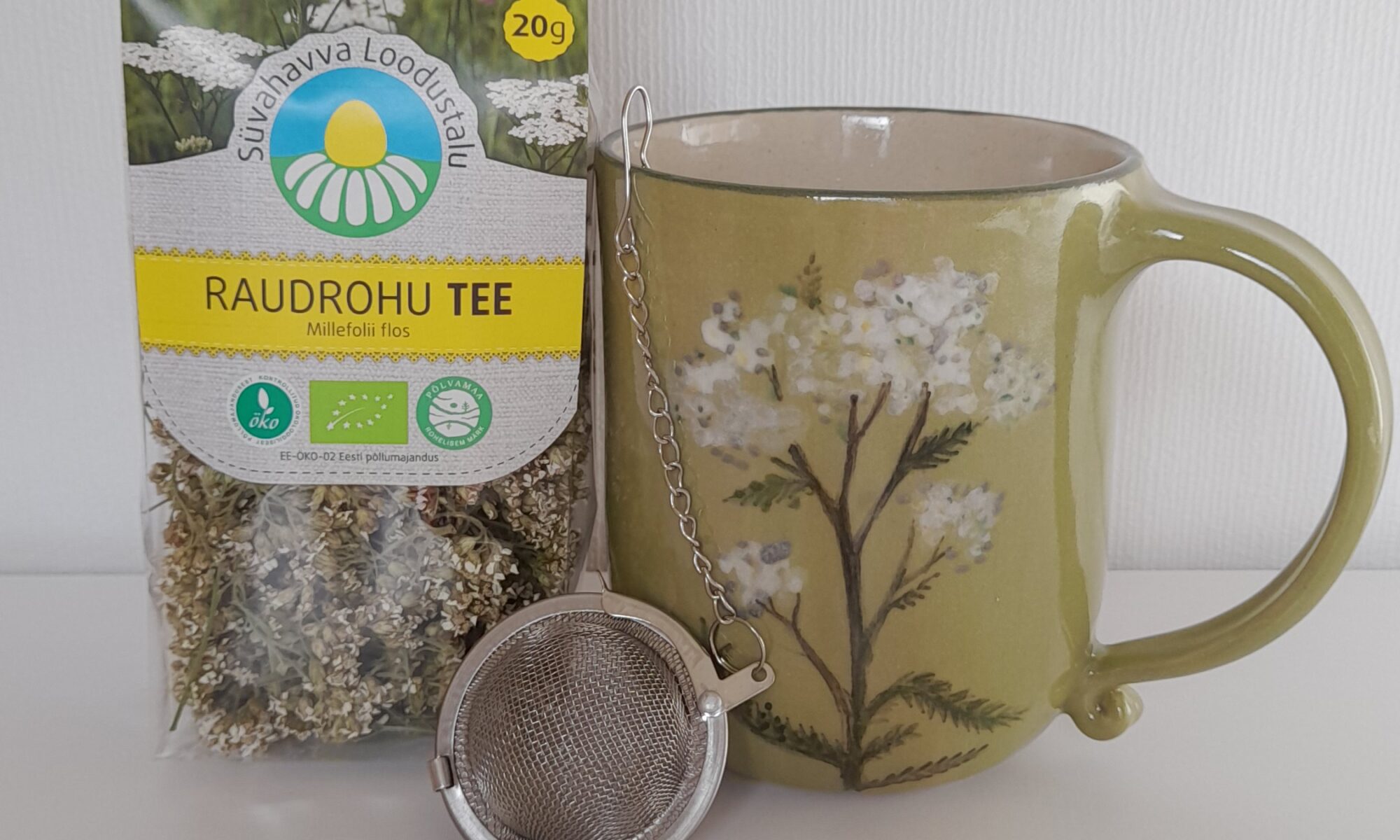 Kinkekomplekt sisaldab käsitööna valminud teetassi, mahe raudrohu teed 20g ja teesõela.