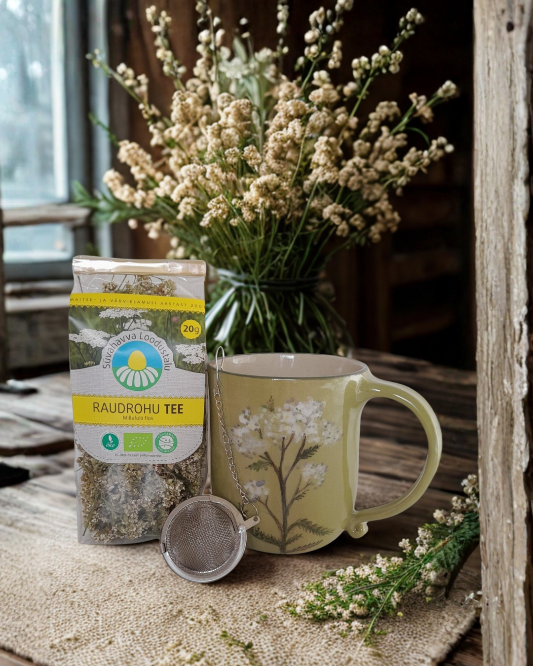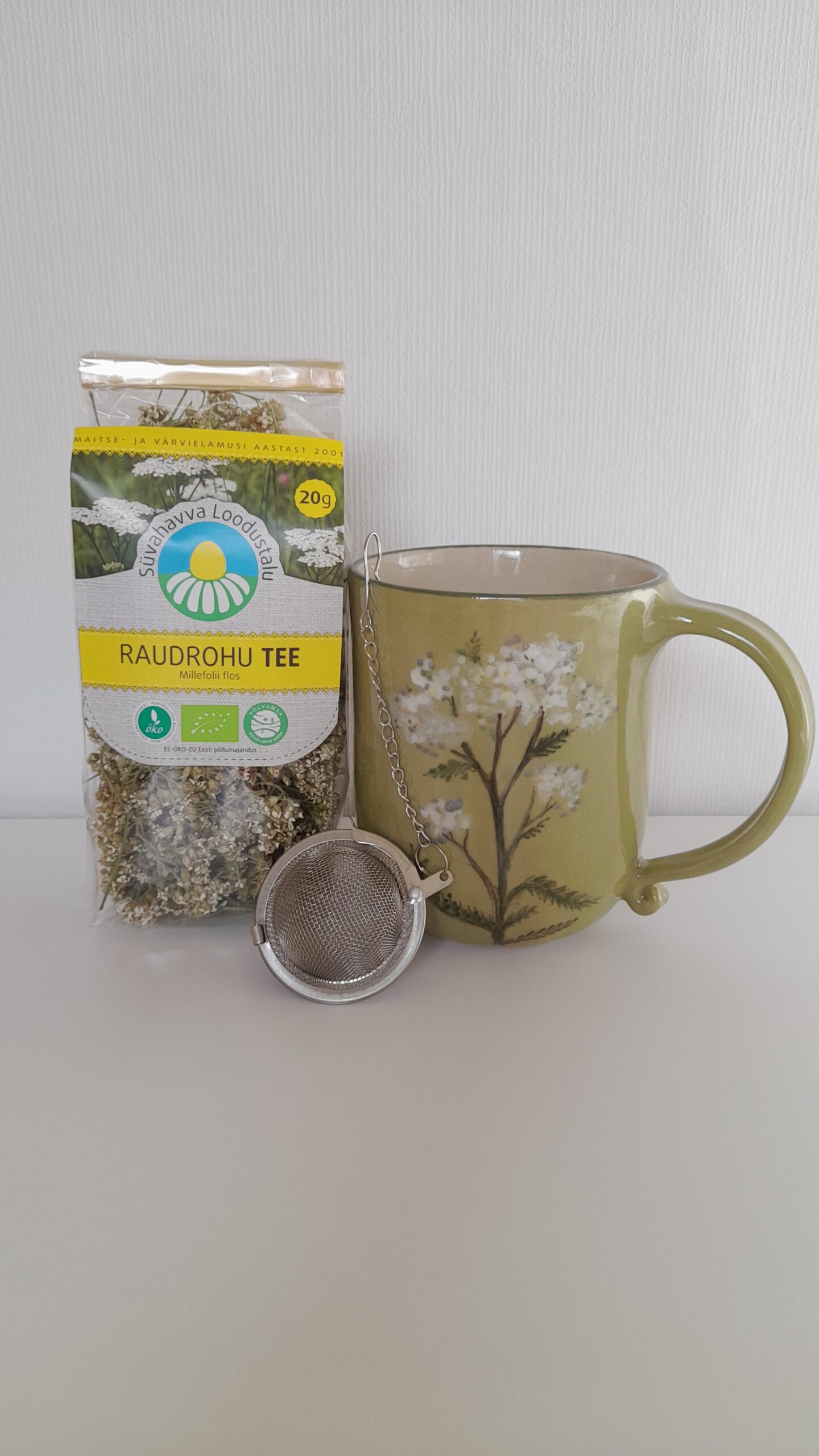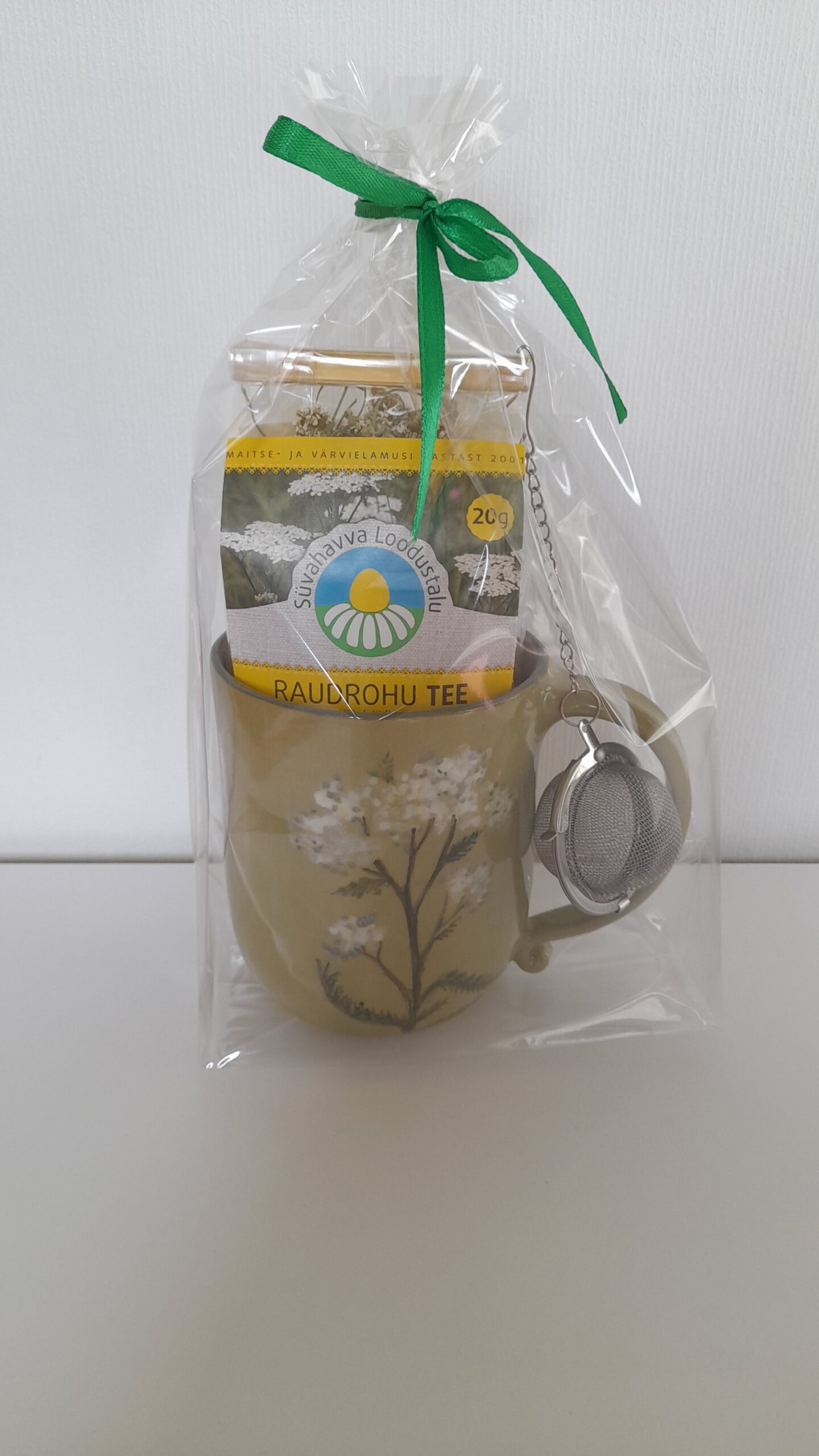 Kinkekomplekt sisaldab käsitööna valminud teetassi, mahe raudrohu teed 20g ja teesõela.
